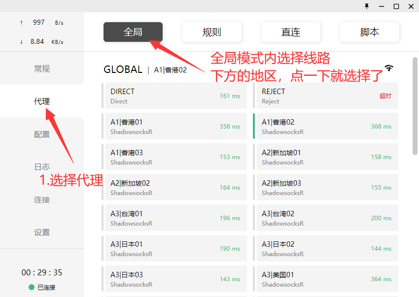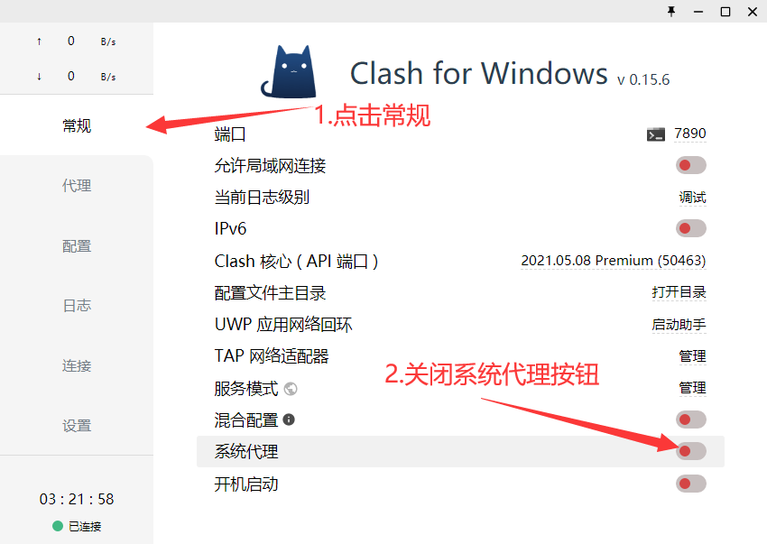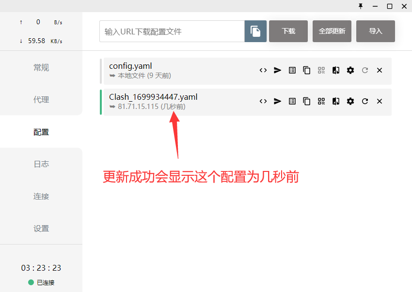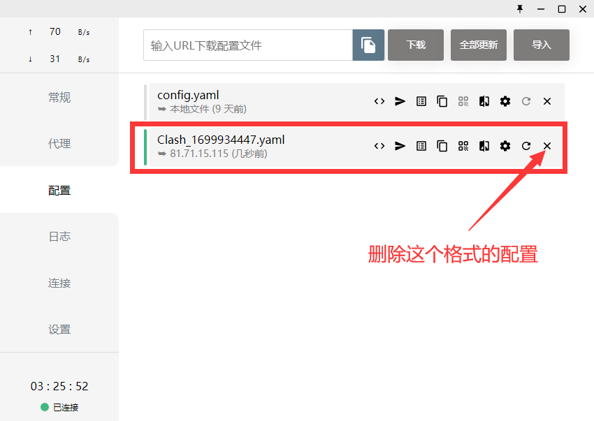 ### 1.打开clash,关闭常规界面的系统代理  ### 2.选择配置页面,点击全部更新  ### 3.更新成功会显示这个配置为几秒前,如果提示网络错误或者更新失败,请前往官网重新导入配置  ### 如果提示网络错误或者更新失败,请前往官网重新导入配置,下方为重新导入教程 1.删除原有的配置  2.浏览器内打开官网地址,然后登录,账户是您注册过的,一般是您的邮箱,如忘记密码,请点击忘记密码找回 如果无法进入官网,请检查是否断开vpn连接(需要断开连接进入)以及尝试开关wifi 最新网址: cn1.jichiyun.sbs 备用地址: cn3.jichiyun.com 备用地址2: cn.jichiyun.vip  登录后,点击首页下发的clash订阅,选择一键导入  导入完成后,会自动跳转到calsh for windows的配置页面  然后选择代理界面,开启选择全局面板,然后根据需求选择地区,右上角wifi图标为测试线路是否通畅  选择常规面板,开启系统代理即完成(系统代理为开关,关闭软件和关电脑前,请确保关了系统代理)  然后就可以上网了,浏览器内输入youtube.com测试